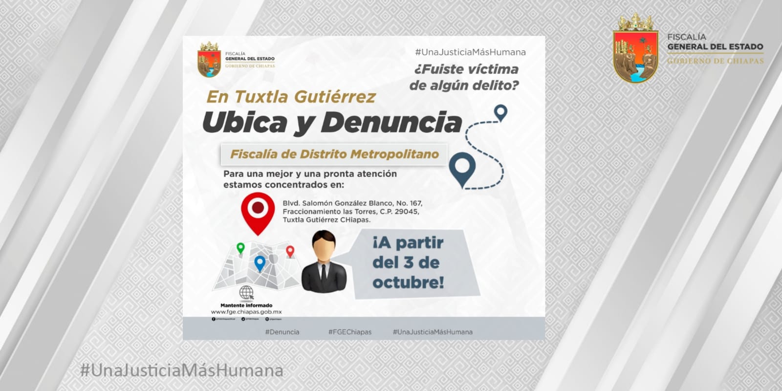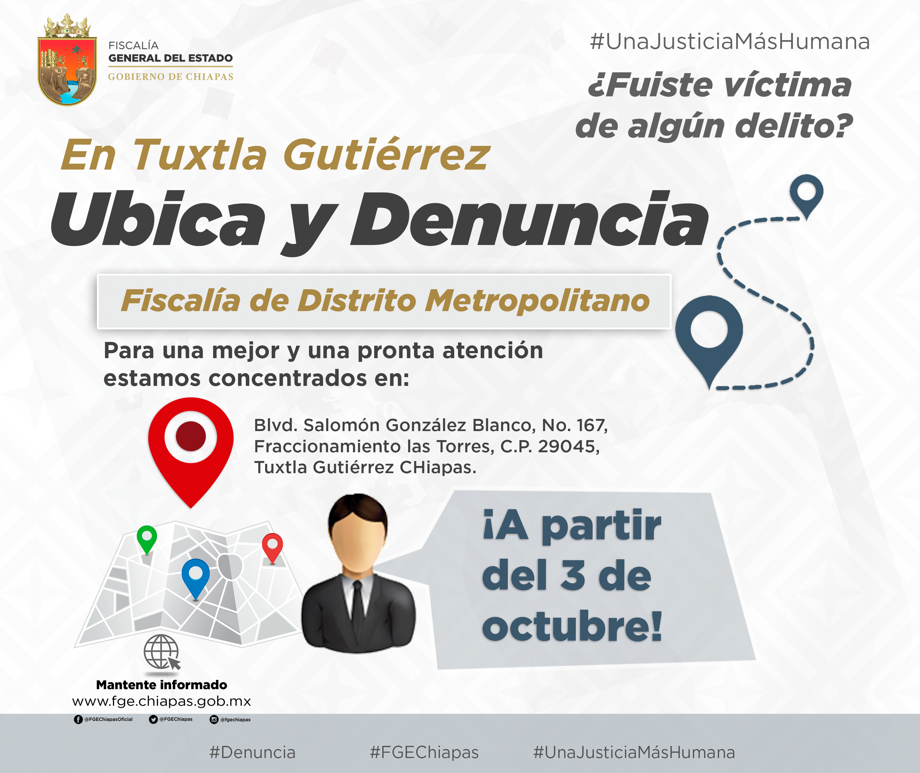 Tuxtla Gutiérrez, Chiapas 29 septiembre. La Fiscalía General del Estado (FGE) informa que a partir del próximo lunes 3 de octubre del presente año, la Fiscalía de Distrito Metropolitano brindará atención al público en sus nuevas instalaciones, ubicadas en boulevard Salomón González Blanco Número 167, fraccionamiento Las Torres, en el municipio de Tuxtla Gutiérrez.