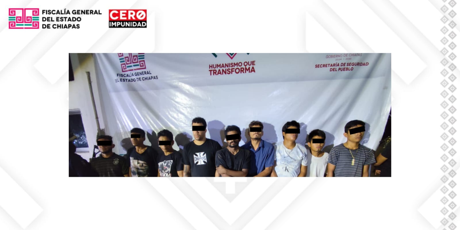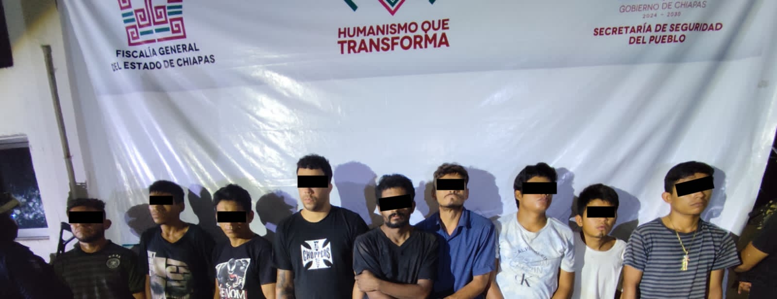 Derivado al Operativo Cero Impunidad, elementos de la Agencia de Investigación e Inteligencia Ministerial y de la Fuerza de Reacción Inmediata Pakal, detuvieron a Edgar “N” de nacionalidad cubana; Miguel “N”, Jaime “N” y José “N” de nacionalidad hondureña; así como Kevin “N”, Erick “N”, Benjamín “N”, Brayan “N” y Diego “N” de nacionalidad mexicana.