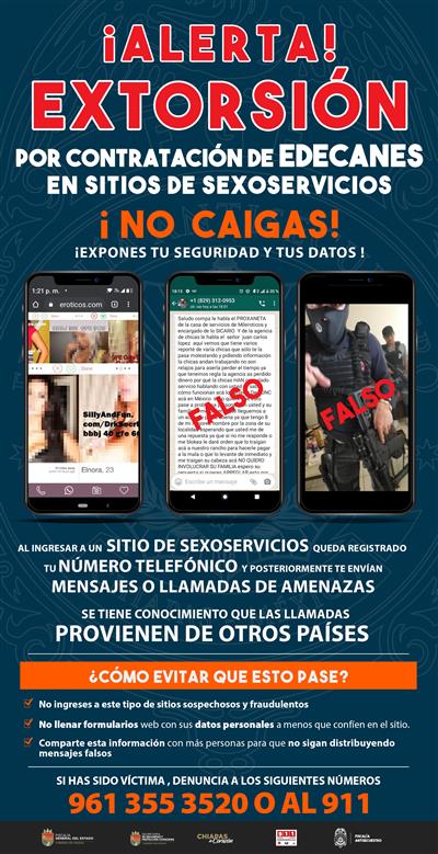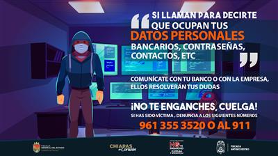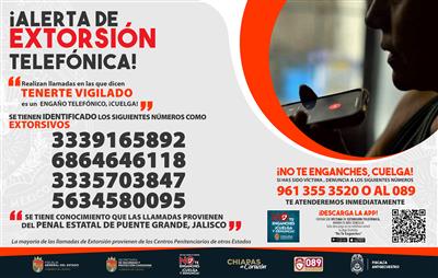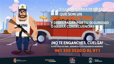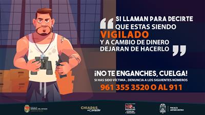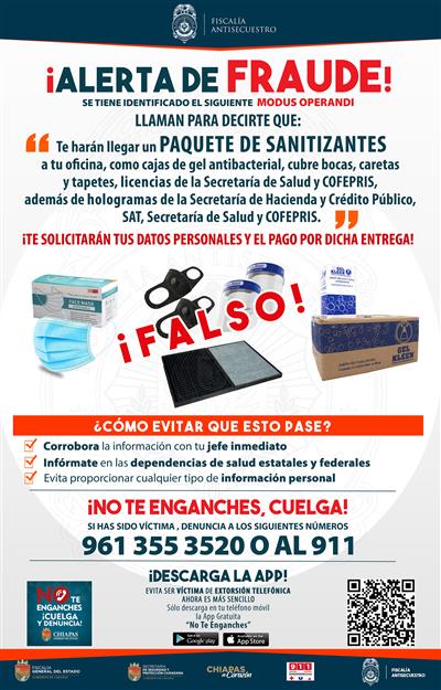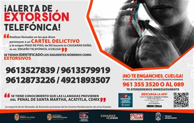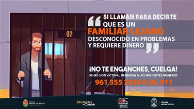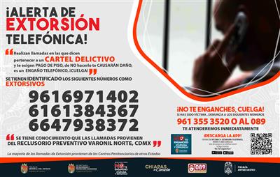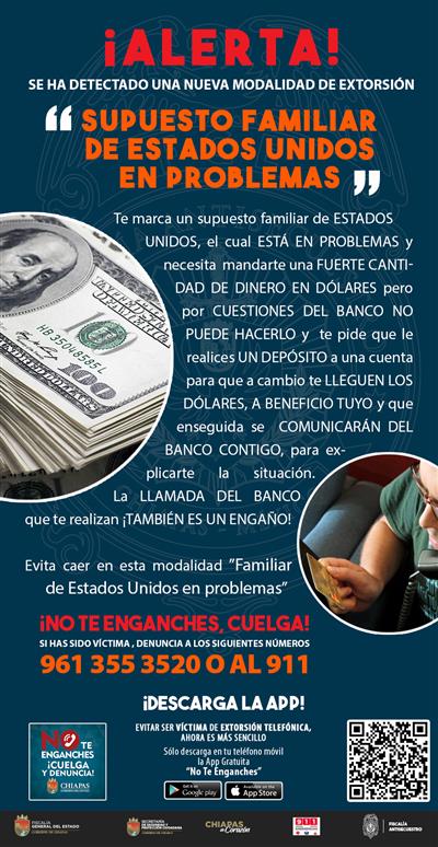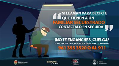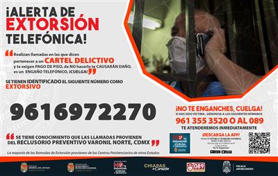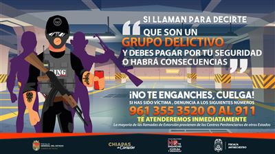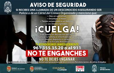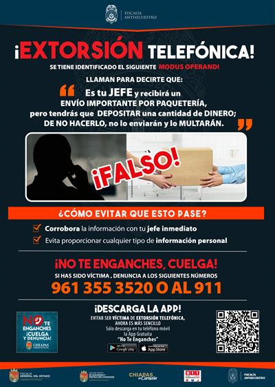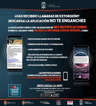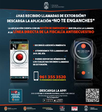 Por lo anterior, es importante mencionar e invitar a la ciudadanía que conozca la aplicación móvil gratuita llamada NO TE ENGANCHES ¡CUELGA Y DENUNCIA! desarrollada en conjunto con la Secretaria de Seguridad y Protección Ciudadana y Fiscalía General del Estado de Chiapas, con la finalidad de evitar ser víctima de los extorsionadores. Esta aplicación es alimentada por una base de datos de números telefónicos reportados por la ciudadanía; una vez descargada la aplicación en el celular y al recibir este una llamada de un nuevo número, se podrá realizar la denuncia a través del botón de emergencia del aplicativo y ser atendido por personal de la Fiscalía Antisecuestro; otras opciones que contiene esta aplicación, es de consultar si un número telefónico se encuentra reportado en la base de datos, realizar el reporte de extorsión de manera escrita y de esa misma manera obtendrá respuesta, por último, cuando reciba un llamada de un número ya reportado en automático la aplicación envía un mensaje de alerta y así se evita contestar.