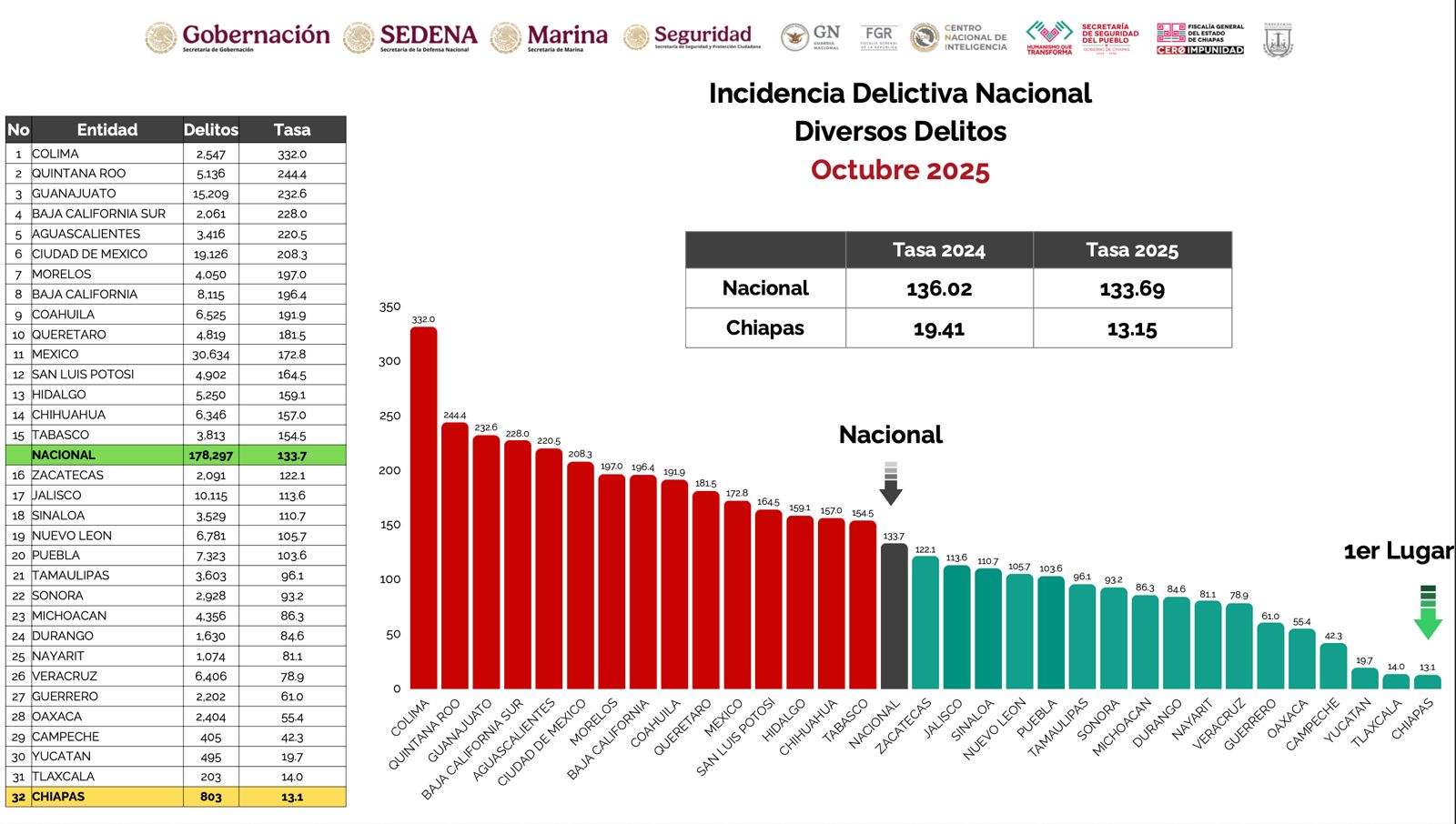 El Fiscal General del Estado, Jorge Luis Llaven Abarca, destacó que, según el Secretariado Ejecutivo del Sistema Nacional de Seguridad Pública, de enero a octubre de 2025, Chiapas se encuentra en segundo lugar a nivel nacional en disminución de incidencia delictiva general, con una puntuación de 160.5, sólo por debajo de Tlaxcala con 150.3; una cifra muy por debajo de la media nacional que es de mil 280 delitos por cada 100 mil habitantes.