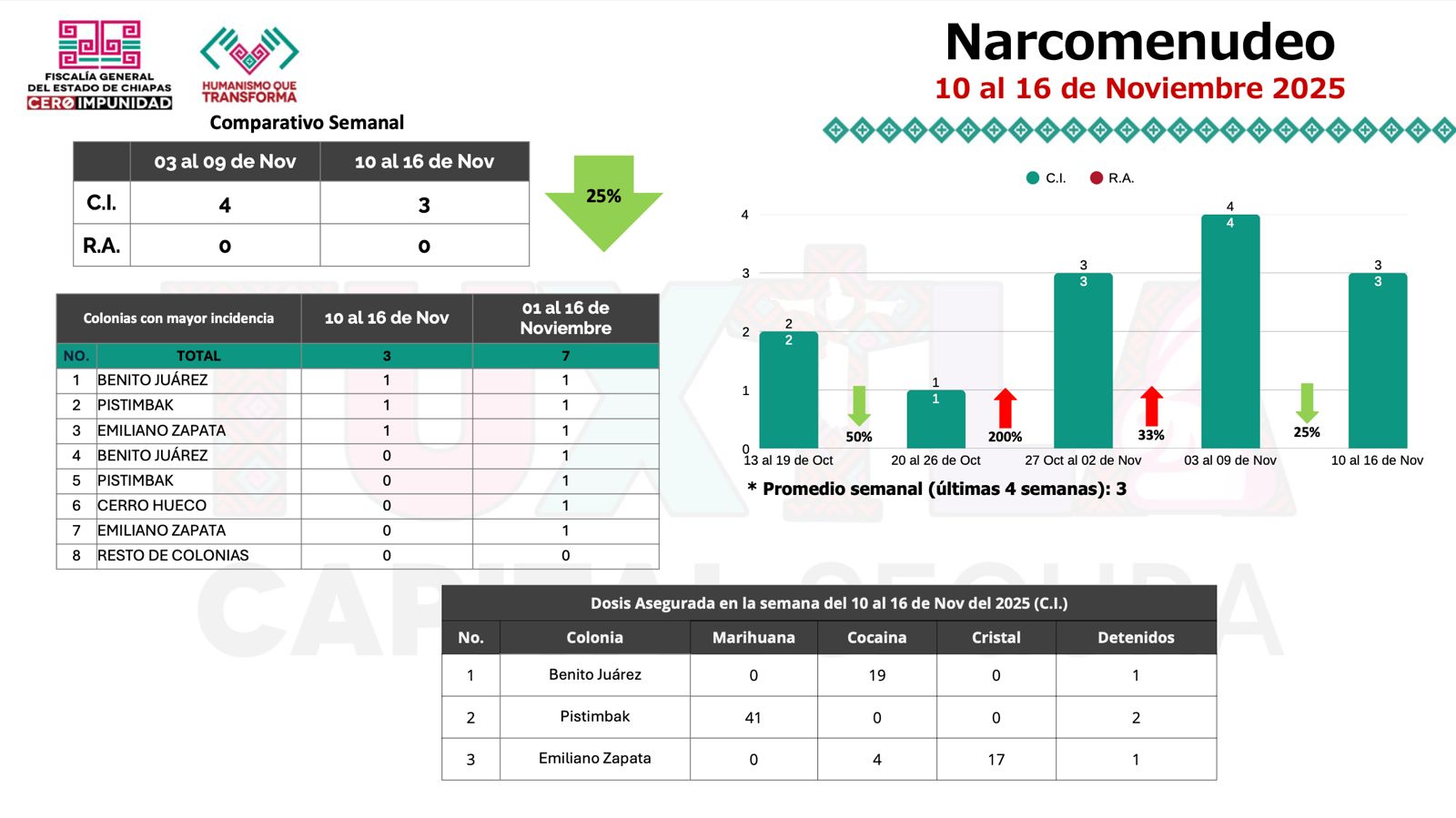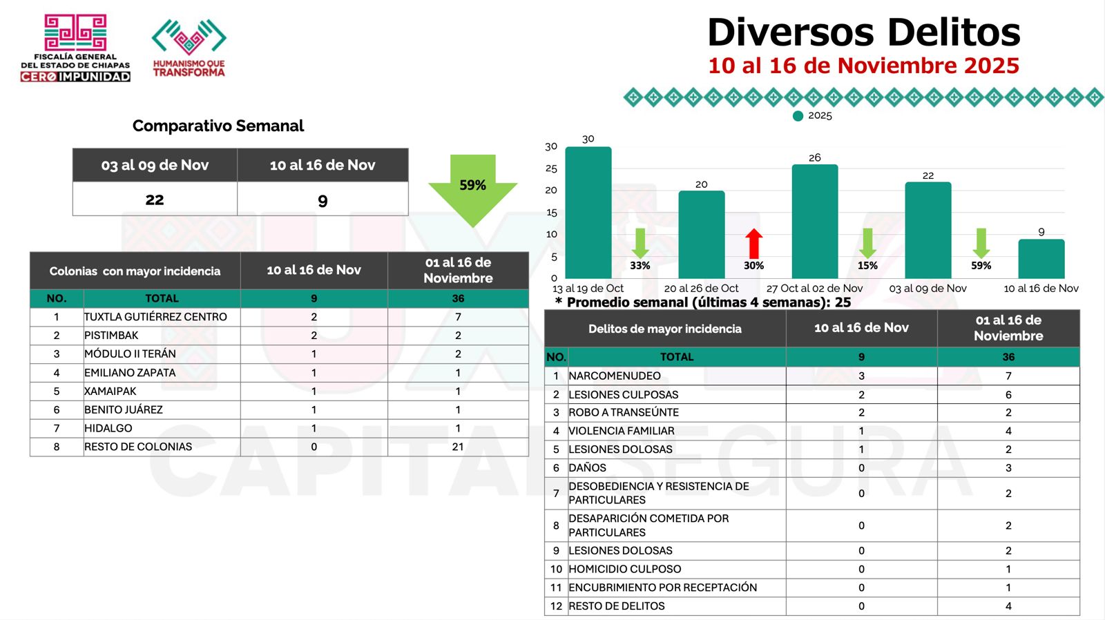 Al abordar la incidencia general durante la semana del 10 al 16 de noviembre Tuxtla Gutiérrez, el Fiscal General puntualizó que tuvo un descenso del 59 por ciento. Se iniciaron nueve carpetas de investigación, a diferencia de las 22 iniciadas la semana anterior. Los delitos más comunes fueron narcomenudeo, lesiones culposas y violencia familiar, mismos que ocurrieron principalmente en las colonias Centro, Pistimbak y Terán.
