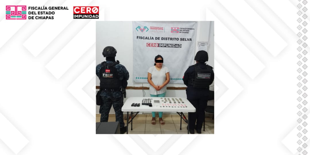 La Fiscalía General del Estado y la Secretaría de Seguridad del Pueblo detuvieron en flagrancia a Janeth “N”, como presunta responsable de los delitos contra la salud en su modalidad de narcomenudeo con fines de comercio, y de violación a la Ley Federal de armas de fuegos y explosivos, en su modalidad de portación de arma de fuego de uso exclusivo del Ejército, Armada y Fuerza Aérea, por hechos ocurridos en la ciudad de Palenque.