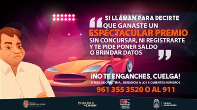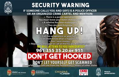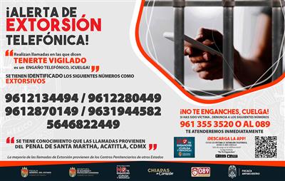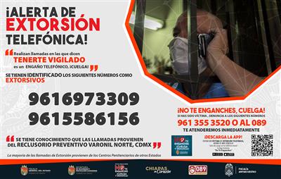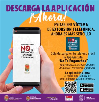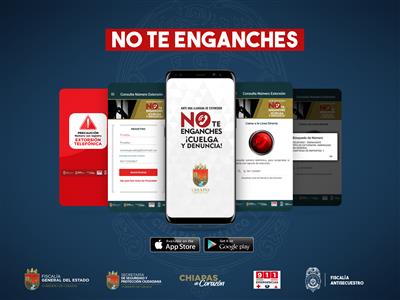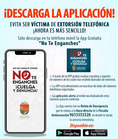 Por lo anterior, es importante mencionar e invitar a la ciudadanía que conozca la aplicación móvil gratuita llamada NO TE ENGANCHES ¡CUELGA Y DENUNCIA! desarrollada en conjunto con la Secretaria de Seguridad y Protección Ciudadana y Fiscalía General del Estado de Chiapas, con la finalidad de evitar ser víctima de los extorsionadores. Esta aplicación es alimentada por una base de datos de números telefónicos reportados por la ciudadanía; una vez descargada la aplicación en el celular y al recibir este una llamada de un nuevo número, se podrá realizar la denuncia a través del botón de emergencia del aplicativo y ser atendido por personal de la Fiscalía Antisecuestro; otras opciones que contiene esta aplicación, es de consultar si un número telefónico se encuentra reportado en la base de datos, realizar el reporte de extorsión de manera escrita y de esa misma manera obtendrá respuesta, por último, cuando reciba un llamada de un número ya reportado en automático la aplicación envía un mensaje de alerta y así se evita contestar.